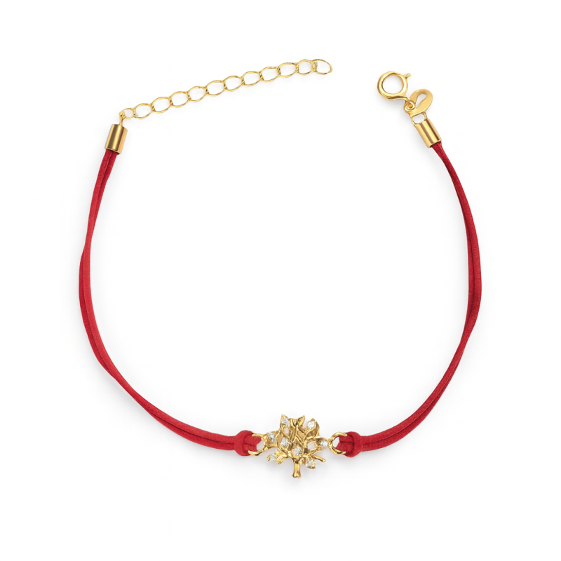 Elegantní stříbrný pozlacený náramek na červeném provázku s motivem stromu života zdobeným zirkony. Symbolický a jemný šperk vhodný pro ženy i dívky, ideální jako dárek nebo doplněk pro každodenní nošení i slavnostní příležitosti.