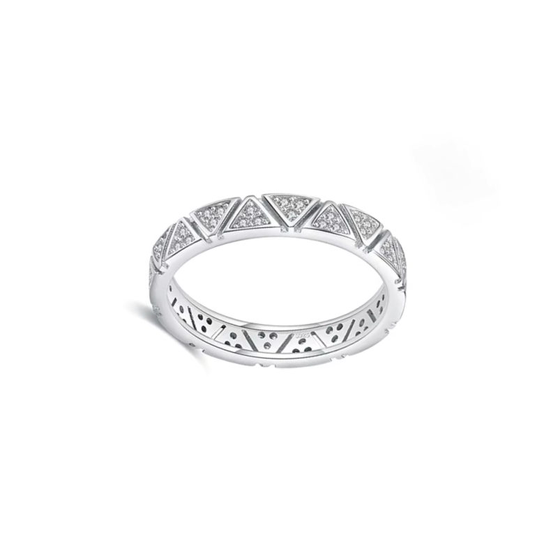 Moderní stříbrný prsten ve tvaru trojúhelníku, zdobený jemnými zirkony. Geometrický a nadčasový design, který dodává šperku unikátní třpyt a elegantní výraz pro každodenní nošení i slavnostní příležitosti.