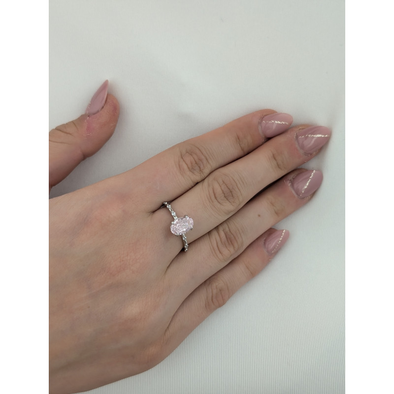 Romantický stříbrný prsten s růžovým oválným zirkonem ve stylu crushed ice. Jemný třpyt a originální brus dodávají šperku luxusní vzhled. Ideální prsten pro ženy, které milují něžné barvy a elegantní design.