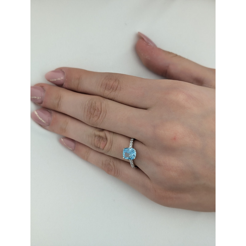 Elegantní stříbrný prsten se světle modrým zirkonem ve tvaru cushion cut, doplněný drobnými čirými zirkony po stranách. Romantický šperk pro každodenní nošení i speciální příležitosti, ideální jako dárek.