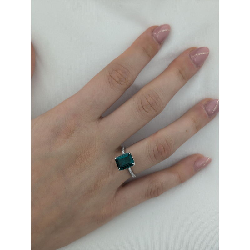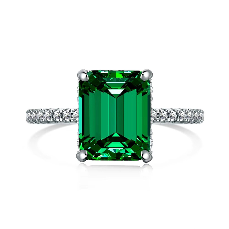 Elegantní stříbrný prsten se syntetickým smaragdem v sytě zelené barvě. Jemné čiré zirkony jsou osazeny do poloviny prstenu, což dodává šperku jemný třpyt a luxusní vzhled. Ideální dárek pro ženy s vytříbeným vkusem.
