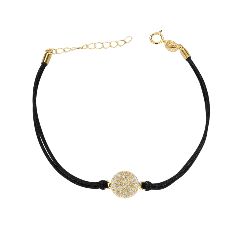 Elegantní stříbrný pozlacený náramek na černé šňůrce s motivem kolečka zdobeným zirkony. Jemný a moderní šperk vhodný pro ženy i dívky, ideální jako dárek nebo doplněk pro každodenní nošení i slavnostní příležitosti.