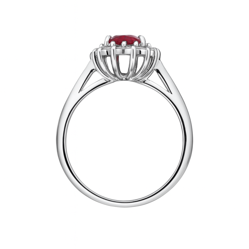 Představujeme skutečný klenot, který si podmaní srdce každé ženy – náš luxusní zásnubní prsten HALO. Centrem designu je majestátní oválný rubín o hmotnosti 1,35 ct, jehož sytě červená barva symbolizuje hloubku vaší vášně. Rubín je obklopen zářivým lemem z precizně osazených diamantů (Halo design), které opticky zvětšují centrální kámen a dodávají prstenu neuvěřitelnou brilanci. Celý prsten je vyroben z elegantního bílého 14k zlata. Ke šperku obdržíte certifikát pravosti kamene.