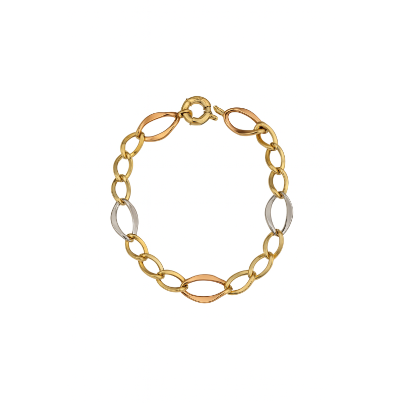 Elegantní zlatý náramek z trojbarevného zlata s oválnými očky, délka 18,5 cm. Kombinace žlutého, bílého a růžového zlata vytváří originální a luxusní design. Stylový doplněk pro ženy, ideální pro každodenní nošení i výjimečné příležitosti.