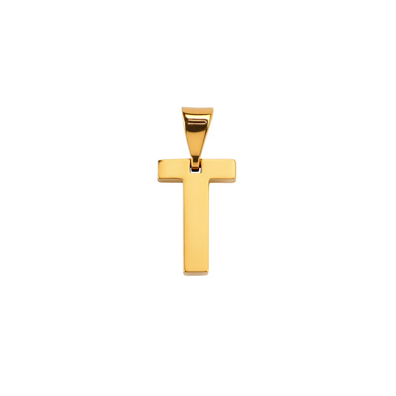 Jemný zlatý přívěsek ve tvaru tiskacího písmene T o velikosti 1 cm. Stylový osobní šperk vhodný pro každodenní nošení i jako dárek pro ženy i muže.